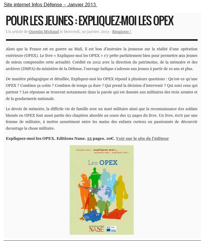 Les « Opex » : une abréviation qui désigne les « opérations extérieures », ces interventions militaires que la France engage parfois hors de ses frontières. Depuis la fin de la guerre d’Algérie, on en compte plus d’une centaine, aux noms étranges et pourtant familiers : opération Daguet, Pamir, Harmattan… Aujourd’hui encore, les armées françaises agissent sous mandat de l’ONU sur plusieurs continents. Les Opex sont méconnues : leur variété et leur éloignement ne facilitent pas les choses !